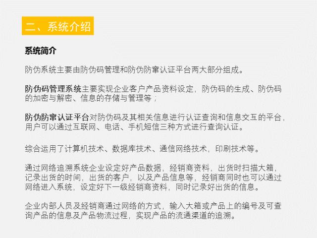 防伪系统主要由防伪码管理和防伪防窜认证平台两大部分组成。